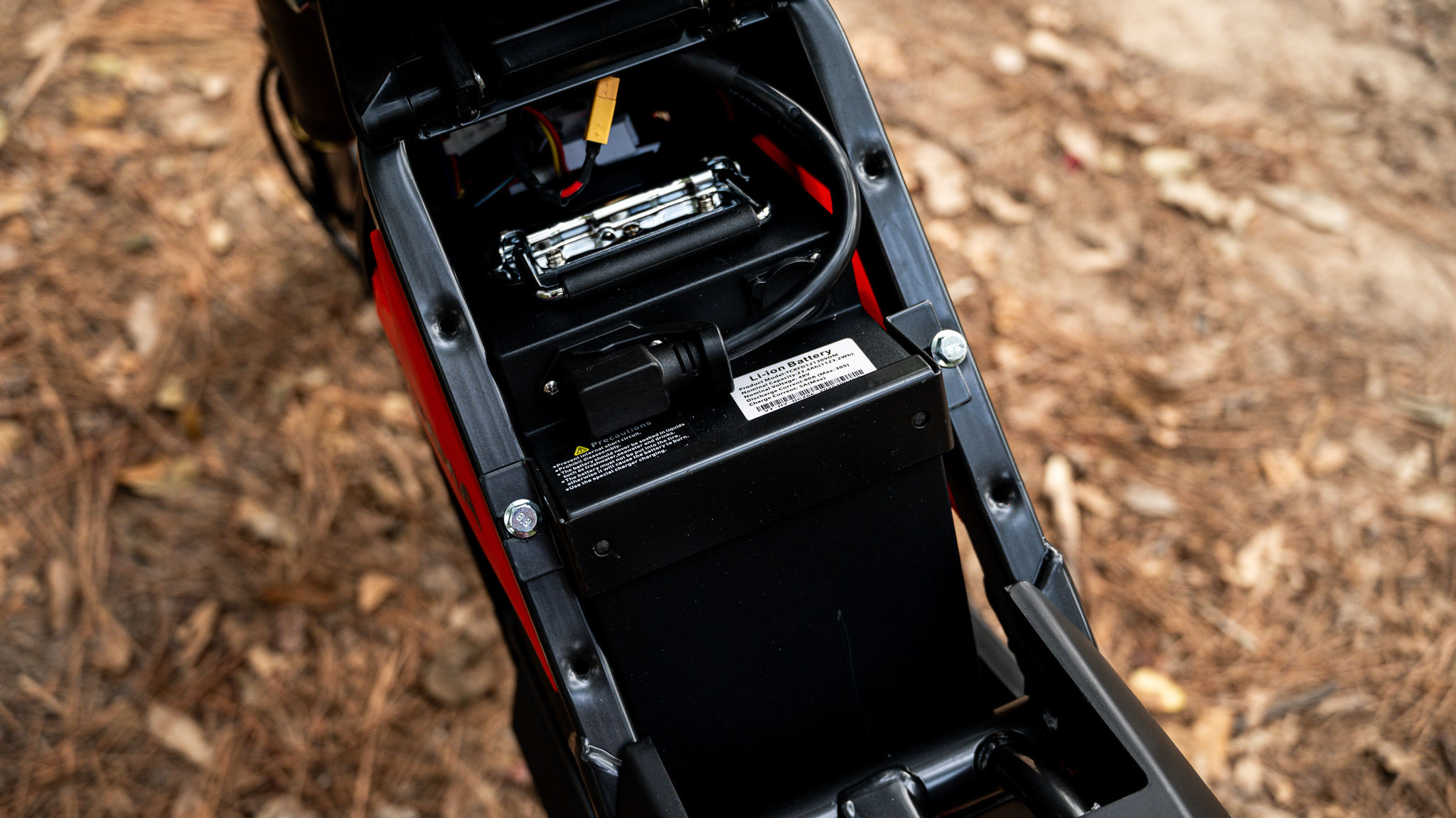 The battery used here, as you can see in the photos, is pretty typical of this style of e-dirtbike. Nothing too fancy, but one nice addition is the bar clamp that keeps the battery in place. Tuttio has a clamping system, but it’s got too many moving parts for my liking, especially given the use case here.